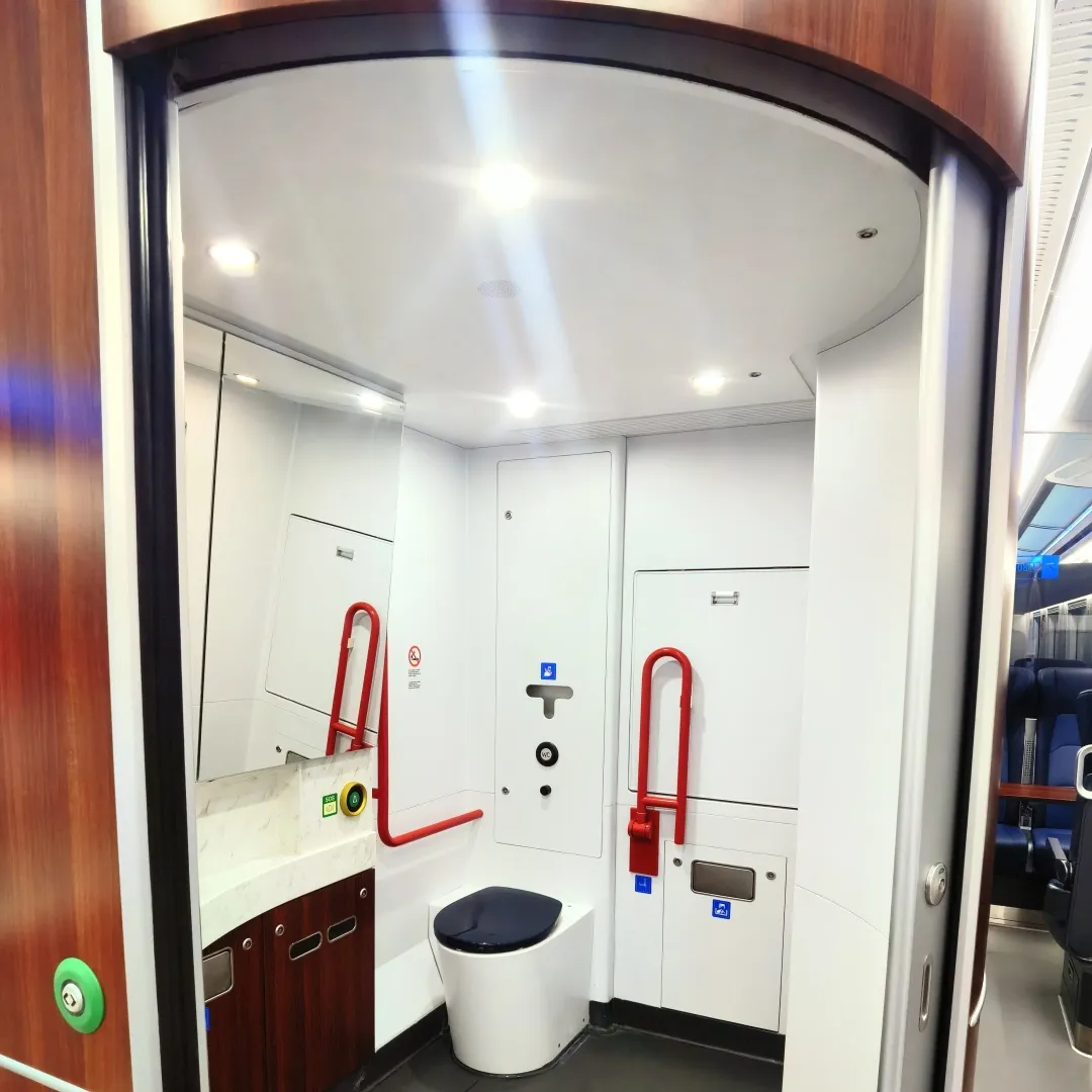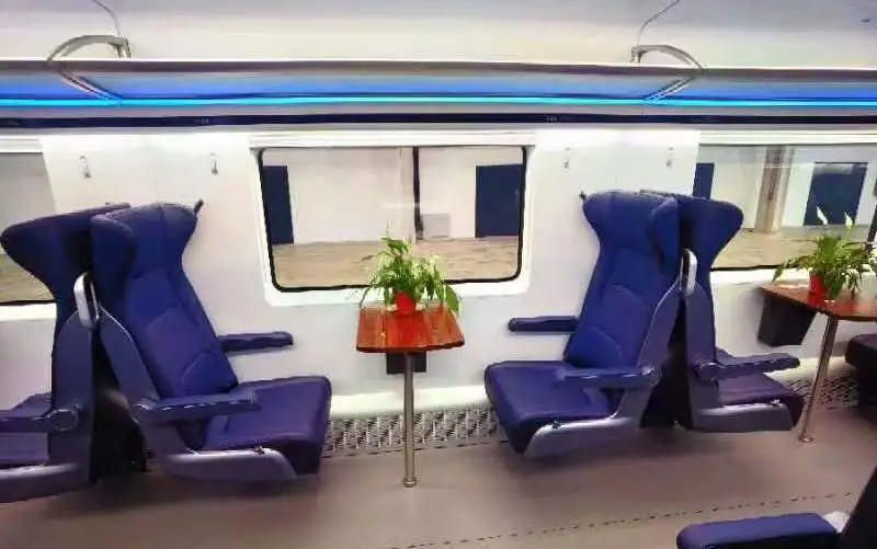 匈塞鐵路高速動(dòng)車組為動(dòng)力分散型電力動(dòng)車組,最高運(yùn)行時(shí)速200公里,全長約103米,采用4輛編組,設(shè)一等座車1輛、二等座車3輛,總定員250人,動(dòng)車組配置動(dòng)力電池,在無電區(qū)域仍具備自主續(xù)航能力。車體外觀呈流線型,采用塞爾維亞國旗色“紅、藍(lán)、白”三色涂裝,車頭側(cè)面黑色區(qū)域造型提取了塞爾維亞國徽雙頭鷹元素,藍(lán)色漸變的色帶宛如雄鷹展開的羽翼;紅藍(lán)兩條色帶分別象征著“新絲綢之路”和“21世紀(jì)海上絲綢之路”,體現(xiàn)了中塞兩國高質(zhì)量共建“一帶一路”,攜手實(shí)現(xiàn)共同發(fā)展繁榮的美好愿景;內(nèi)裝色彩與車外造型相互呼應(yīng),氛圍燈、智能座位顯示等細(xì)節(jié)充分體現(xiàn)動(dòng)車組現(xiàn)代化、智能化、人性化的設(shè)計(jì)理念。動(dòng)車組車廂內(nèi)設(shè)置輪椅、自行車、大件行李存放區(qū),配備咖啡機(jī)、售賣機(jī)等服務(wù)設(shè)施,努力滿足旅客多樣化需求。